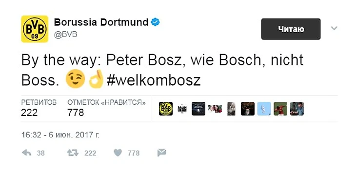 Официальный #Twitter дортмундской «Боруссии» указал правильный вариант фамилии нового главного тренера. На немецкий язык фамилия голландца Bosz переводится как Bosch. Сочетание согласных [sch] приравнивается к русскому звуку [ш], поэтому в итоге получаем Петер Бош.