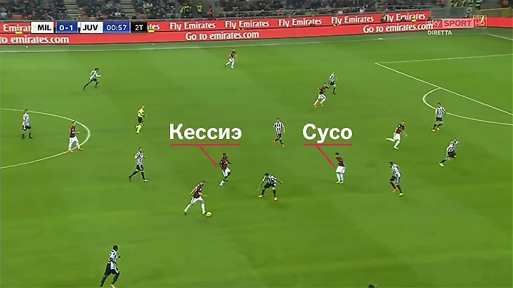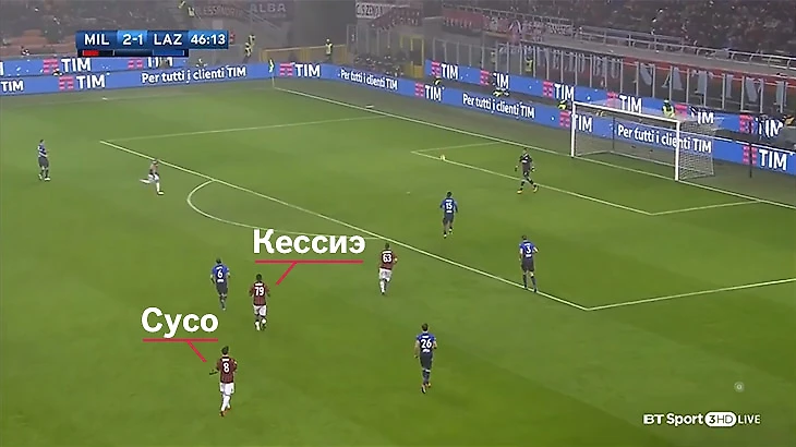 Ниже играет Бонавентура, и это супер: они с Хаканом настроены на одну волну, творчески подходят к игре и охотно меняются позициями (оба умеют играть и в центре, и на фланге). Настроенность дуэта на игру слева и фланговая привязка Сусо освобождает большую часть зоны трекварти: это позволяет Кессиэ свободно действовать по вертикали, полностью используя задатки бокс-ту-бокса.