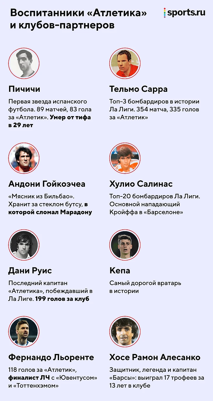 В молодости Гаиска Гаритано жил возле клубной базы и с балкона следил за двухсторонками, а сегодня сам тренирует «Атлетик». Икер Муниаин мечтал поиграть с Эчеберрией, попал в главную команду задолго до совершеннолетия и все время тянулся в ночные клубы, но охранники грозили позвонить тренеру и отправляли парня домой. Иньяки Уильямс отказывал топ-клубам и недавно поставил рекорд ХХI века по количеству матчей подряд среди полевых игроков.