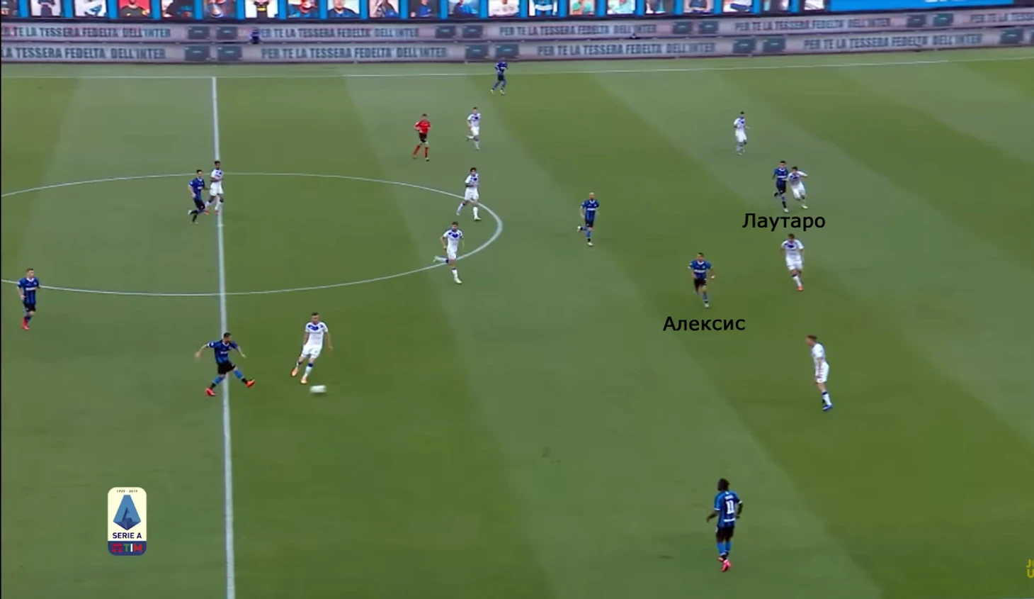 Стандартная структура нападения «Интера»: Алексис опускается в трекварти и участвует в строительстве атаки, а Лаутаро угрожает забегом за спины и увеличивает зону между линиями.