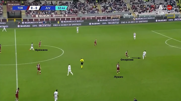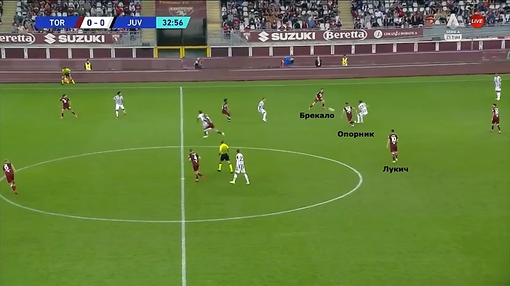 Эпизод из матча с «Ювентусом» показывает эффективность такого прессинга. Ювентини начинают розыгрыш от вратаря, и опорник Мандрагора сразу агрессивно нападает на игрока с мячом. Оба атакующих полузащитника – Лукич и Брекало, – лишь перекрывают коридоры передач.