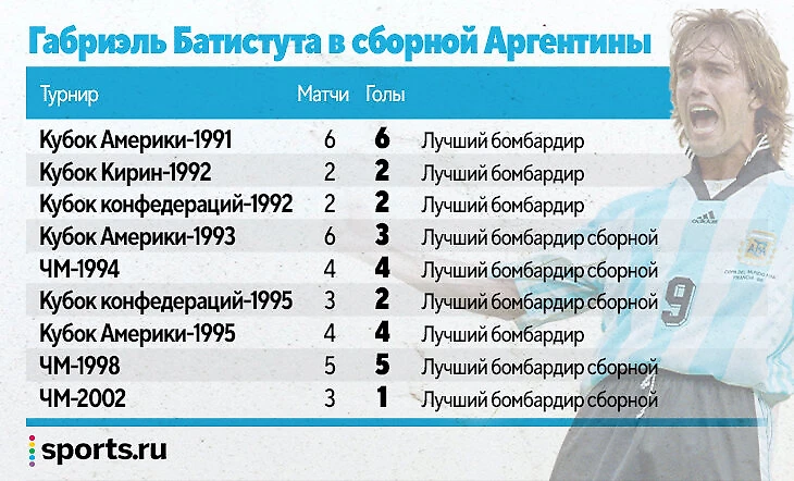 Больше 33-летний Батистута не вызывался. Но относительно короткого периода в сборной хватило, чтобы переписать ее рекорды. Батигол ушел лучшим бомбардиром команды (56 голов в 78 матчах), и даже Месси понадобилось в полтора раза больше матчей, чтобы обойти его.