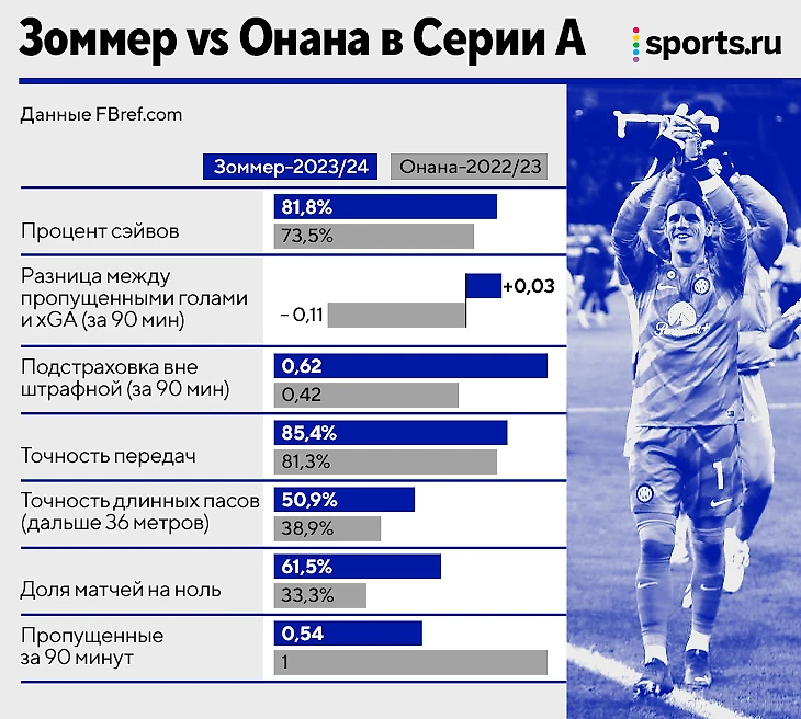 Андре он превзошел практически во всем. Зоммер намного больше дает на линии, в полтора раза чаще страхует вне штрафной, так же хорош на выходах. Его надежность влияет даже чисто тактически. «Интер» позволяет больше, чем раньше: Индзаги больше не нужно подстраиваться под минусы вратаря – например, избегать дальних ударов, потому что у него проблемы с позицией. Новый кипер убедителен в любом ситуации.