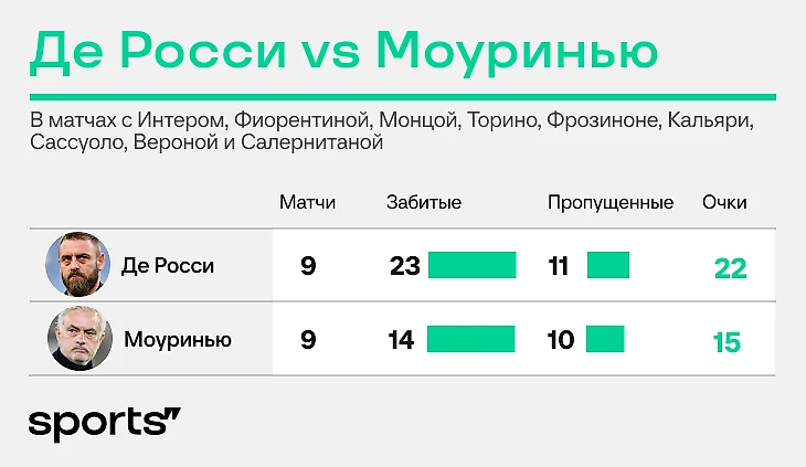 В этих 11 матчах Де Росси набрал 26 баллов – на 7 больше, чем Моуринью против тех же соперников. Результативность выросла почти вдвое. Пропущенные остались на прежнем уровне.