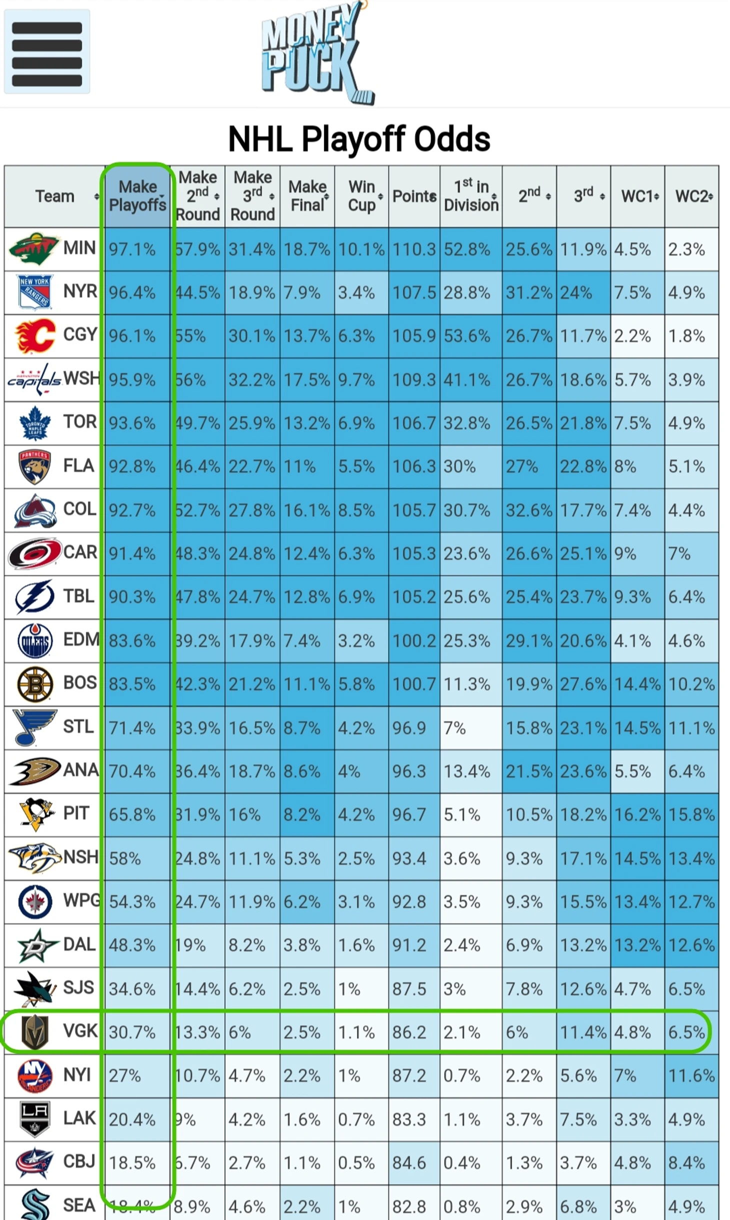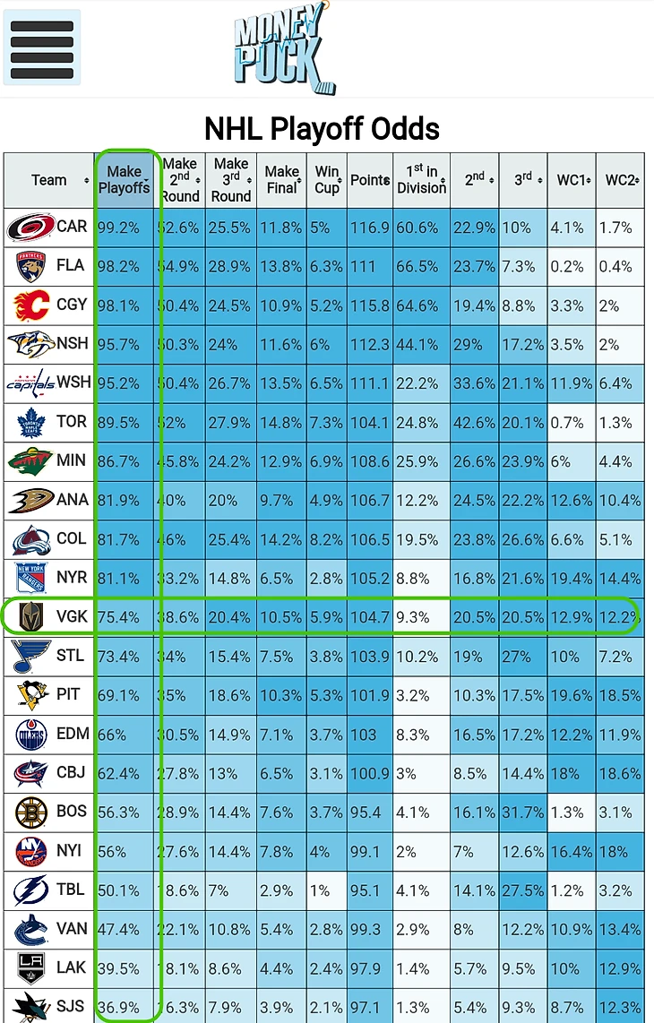 Характерный момент: в те трудные времена, когда команда неделя за неделей не могла выйти на лёд два раза подряд в одном и том же составе, потому что чуть ли не каждый матч кто-то очередной ломался, в «Найтс» многие перестали верить. Некоторые люди всерьёз задавались вопросом, выйдет ли вообще клуб в плей-офф (докатились — кто-то считал, что «Вегас» ухитрится не выйти из Пасифика). Даже moneypuck.com, который обычно достаточно неплохо считает вероятности, 3 декабря давал «рыцарям» вот такие шансы на выход в плей-офф (нужные строка и столбец обведены зелёным):