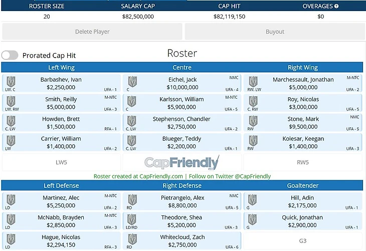 Ниже вы можете увидеть состав «Вегаса» в последнем матче серии с «Эдмонтоном», где возле каждого игрока указан его кэпхит, а вверху — общий кэпхит команды.