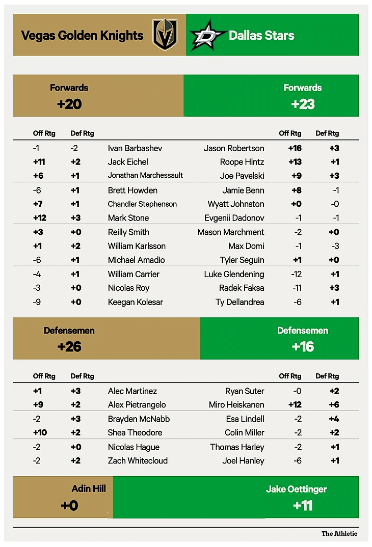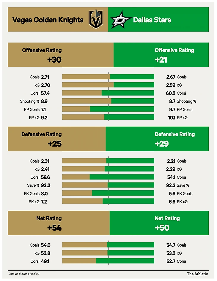 «Даллас» — лучшая команда плей-офф по ожидаемым голам: у них здесь 56,6%. Зато «Вегас» может ответить лучшей среди всех команд плей-офф игрой в равных составах: «рыцари» переигрывают оппонентов 30-15 — у «Старз», для сравнения, разница шайб при игре 5-на-5 всего лишь (+1). Но ещё один важный пункт — игра в большинстве. «Найтс» в среднем по плей-офф пропускают две шайбы за пять попыток у соперника (60% PK), сами забивают лишь одну за шесть (17,5%). «Старз» же лидируют по игре в большинстве среди оставшихся в живых команд — 31,7%, пятое место из шестнадцати команд плей-офф. 83,3% нейтрализации техасцами большинства соперника же — четвёртый показатель плей-офф, выше из оставшихся в деле лишь «Каролина» с 90%.