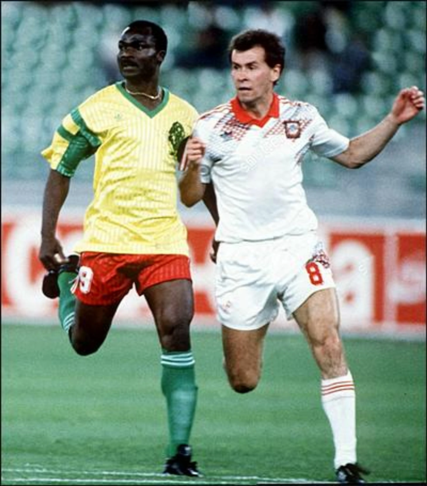 Кто удивил, причем приятно, так это камерунцы, которыми руководил специалист из СССР Валерий Непомнящий. После сенсационной победы в первом туре над Аргентиной – 1:0, «непокорённые львы» одолели и Румынию – 2:1. «Дублем» отличился нестареющий ветеран, 38-летний форвард малоизвестного французского «Сен-Пьерруаз» Роже Мила (на заглавном фото бежит рядом с Геннадием Литовченко). Непомнящий выпустил этого «пенсионера» на последние полчаса матча, и в итоге не прогадал. Таким вот образом аутсайдер Группы «В», которому большинство специалистов отдавали последнее место в компании с Аргентиной, СССР и Румынией, за тур до завершения группового этапа сенсационно завоевал путёвку в плей-офф. То ли ещё будет.