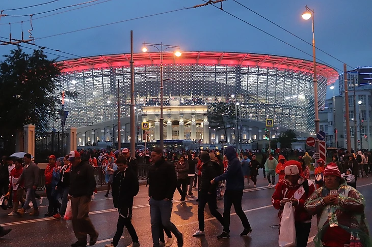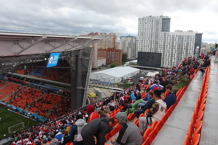 Мне досталось место на четвертом ряду с конца. Один из немногих минусов временной трибуны — по ней гуляет ужасный сквозняк. Кроме того, ты чувствуешь себя отдаленным от праздника. Как будто смотришь футбол с балкона соседнего дома. Рядом со мной сидели болельщики из России, которые ностальгировали по матчам российской премьер-лиги и иногда заряжали кричалки в поддержку нашей сборной.