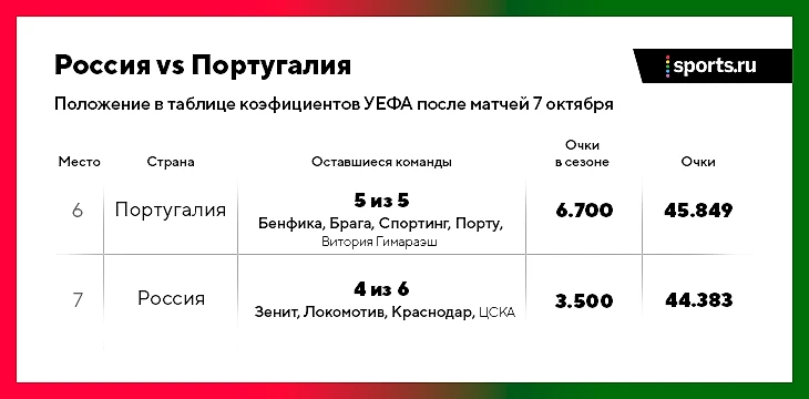 В реальности шансов на возвращение 6-го места не очень много. Сейчас четыре российских клуба («Локомотив», «Зенит», «Краснодар» и с этого тура ЦСКА) набирают очки, которые делятся на шестерых, а португальцы впятером набирают очки, которые делятся на пятерых.
