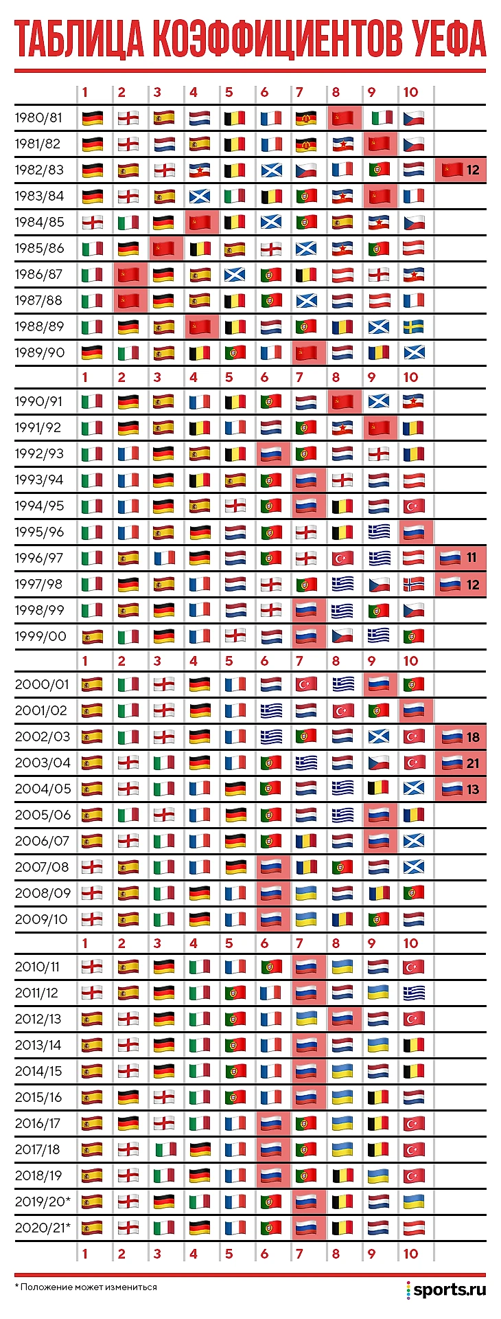 Коэффициенты УЕФА появились 40 лет назад. Россия ни разу не поднялась выше 6-го места, а СССР пару сезонов был вторым
