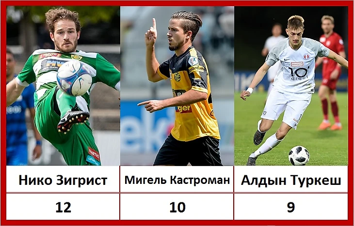 Наконец, замыкает тройку лидеров Алдын Туркеш. Форвард «Рапперсвиль-Йоны» разбросал свои девять мячей по шести играм, сделав в одной из них хет-трик. После пары лет голевого безмолвия в составе «Вадуца» потенциальный нападающий сборной Боснии и Герцеговины (получил первый вызов в «молодёжку» в октябре этого года) раскрылся под руководством Урса Майера и за концовку прошлого вместе с началом нынешнего сезона забил уже 17 мячей. Впрочем, это неудивительно, ведь у Туркеша была довольно солидная результативность на юниорском и молодёжном уровнях. Ему всего 22, и есть все шансы увидеть его в составе команды Суперлиги, или одного из фаворитов Челлендж-лиги.
