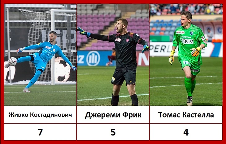 Наибольшее количество матчей на ноль провёл голкипер «Виля 1900» Живко Костадинович. 26-летний швейцарец провёл стабильный отрезок, не допуская явных провалов в результатах. Отчасти это связано и с тем, что партнёры по команде, ответственные за защитную линию грамотно выполняли свою работу и тренерскую установку. «Виль», напомню, крайне неохотно подпускает соперников к своим воротам: в створ приходится менее четырёх ударов в среднем за игру. Костадинович в итоге наиграл на семь «сухих» матчей и пропустил 17 мячей в 18 играх.