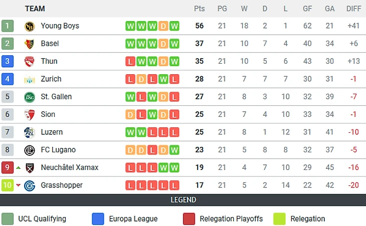 В Суперлиге сменился аутсайдер: «Ксамаксу» удалось выиграть встречу в Цюрихе и таки обойти 27-кратного чемпиона на два очка. Четыре очка отделяют нёвшательцев от «Лугано». Старт Аншо удался, и после победы над «Люцерном» были получены важнейшие три очка против основного соперника в зоне вылета. «Ксамакс», впрочем, не был особенно хорош, но для того, чтобы обыграть нынешний «Грассхоппер», особого ума не надо: Торстен Финк продолжает экспериментировать, и его эксцентричные потуги не заканчиваются успехом. Финк проиграл шестой матч подряд. Последняя победа «кузнечиков» случилась 25 ноября прошлого года, после того, как стал известен результат голосования о строительстве стадиона. В профессиональном футболе на более или менее приличном уровне это должно означать отставку специалиста. «Грассхоппер», однако же, выбирает особый путь – на послематчевой пресс-конференции спортивный директор рекордмайштера Маттиас Вальтер заявил, что нужно «тщательно проанализировать ситуацию». Складывается ощущение, что либо неустойка, положенная Финку в случае увольнения, для «кузнечиков» слишком высока, либо Вальтер не может признать, что его «тренер мечты» даже с минимальными задачами не справился. Следующая игра «Грассхоппера» – выезд в «Тун». Оберландцы недавно отобрали очки у «Янг-Бойз» и комфортно расположились на третьем месте таблицы. Перспективы команды Финка в этой игре мягко говоря нерадужные. «Ксамакс» же принимает в «Нёвшателе» «Базель», которому, кстати, ещё в этом сезоне не проигрывал.