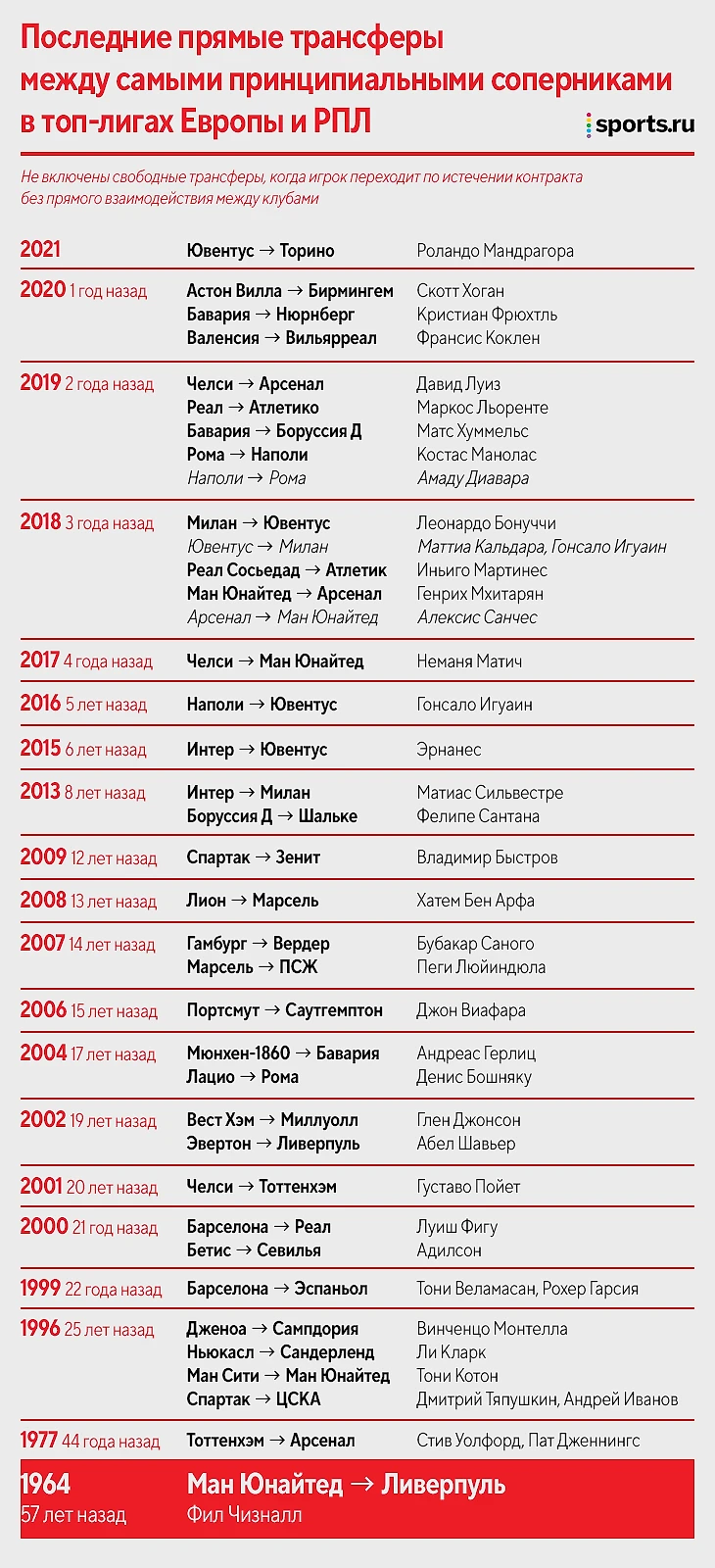 В списке ниже мы собрали прямые трансферы (аренды тоже) между принципиальными соперниками из топ-5 лиг Европы и РПЛ, чтобы показать, насколько сами клубы верны традициям.
