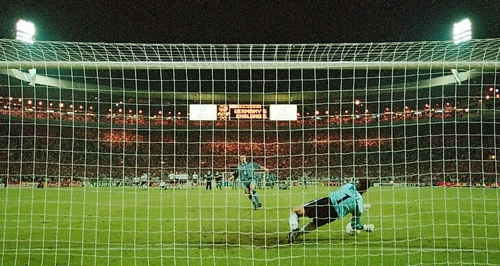 Несмотря на желание прыгать на амбразуру, Саутгейт не должен был ничего бить. Первая пятерка Англии – опытные пенальтисты (хотя Стюарт Пирс и не забил на ЧМ-90). У Германии только 4 человека согласились бить – остальных Берти Фогтс буквально заставлял. Штефан Кунц (восьмой пенальтист в истории Бундеслиги – 30 голов с точки) просил тренера поставить его пятым. Надеялся, что к этому моменту все закончится.