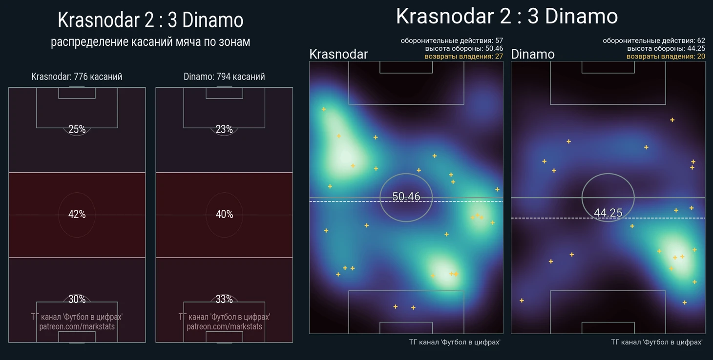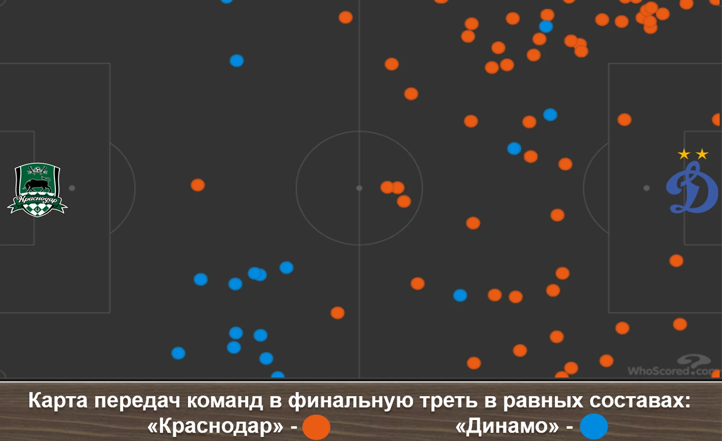 Не случись глупейшего удаления, ещё неизвестно, как бы пошла игра. По фактам: "Краснодар" в равных составах сделал 58 передач в финальную треть; "Динамо" - только 17. Бело-голубые фактически не помышляли об атаке, перманентно теряя мяч на левом фланге.