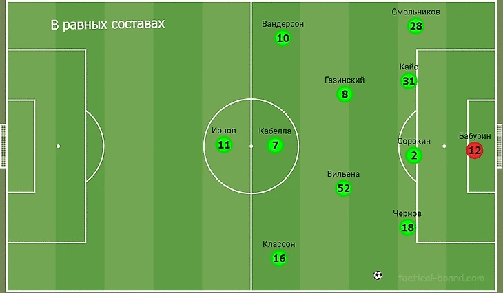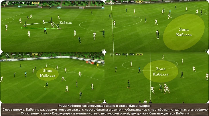 С уходом Кабелла у "Краснодара" пропало связующее звено в атаке. Команда, как и в равных составах, старалась дорожить мячом, комбинируя в одно-два касания и заполняя пространство между линиями. Быстрая комбинационная игра разрушала компактность динамовских построений, вот только зона, в которой должен был находиться Кабелла, пустовала, облегчая задачу бело-голубым.