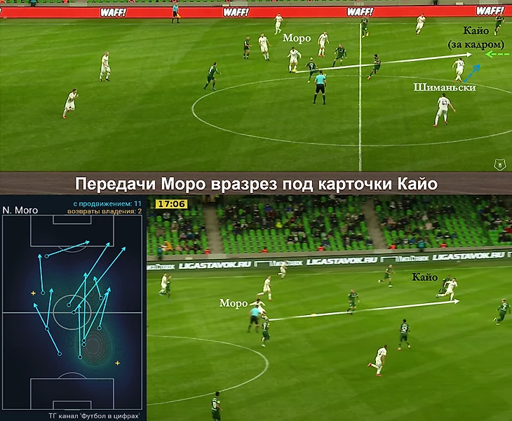 Зато, как мы помним, две его передачи отправили в раздевалку Кайо. Жаль, что в статистике нет такого показателя - передачи на жёлтую или фол соперника. Моро, полагаю, был бы по нему в числе лидеров - с его-то любовь обострять и искать партнёров в пространстве между линиями. Новая позиция в тройке защитников тоже дала свои плоды: хорват получил больше времени на принятие решений и дал старт первой голевой атаке "Динамо" в матче.