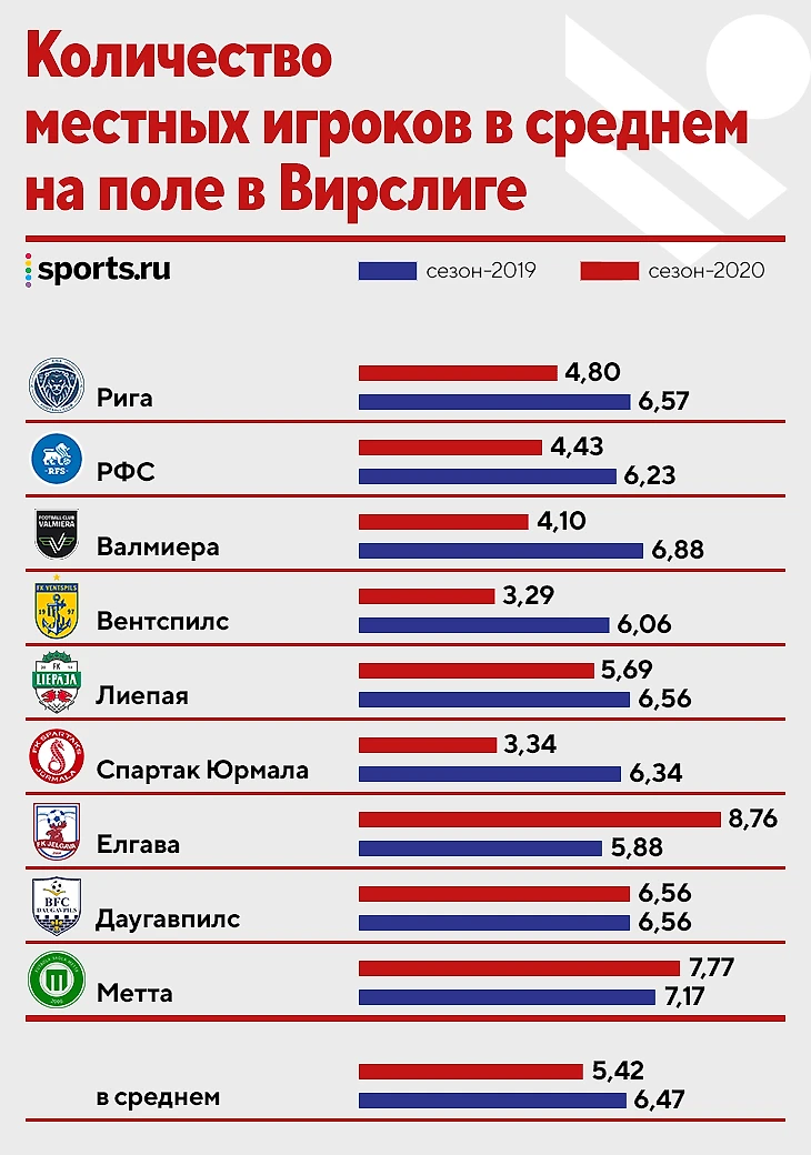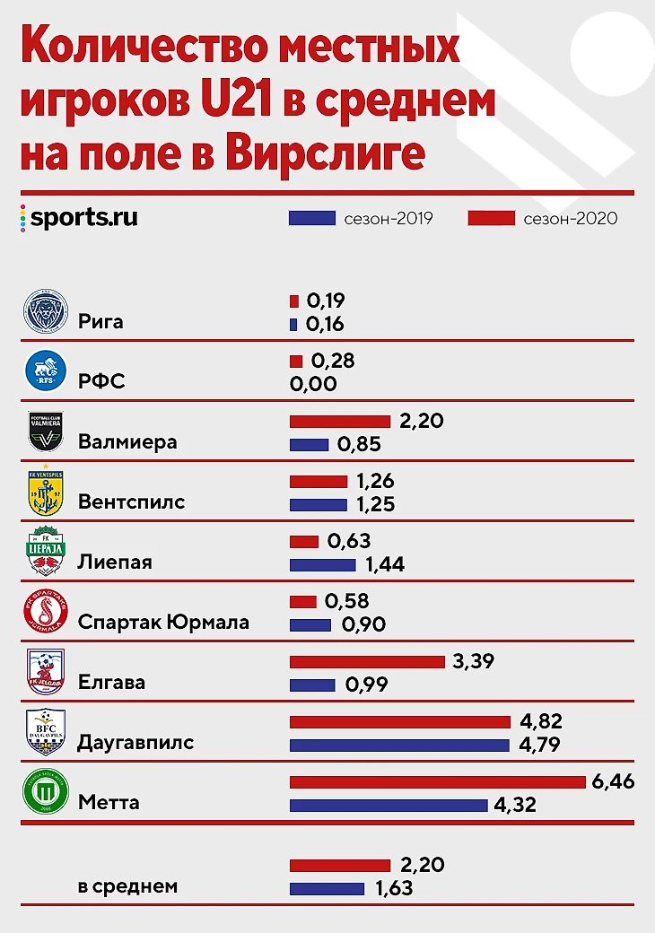 В одном туре Вирслиги на протяжении сезона-2020 играли в среднем 56,8 игрока из Латвии. Выборка более чем достаточна для сборной (при том что практически половина игроков сборной выступают в других чемпионатах). Количество местных молодых игроков U-21, которые теоретически входят в группу повышенного риска из-за наплыва легионеров, наоборот, выросло в каждом клубе – в среднем с 1,63 до 2,36 (в том числе это связано с финансовой мотивацией из-за нового фонда).