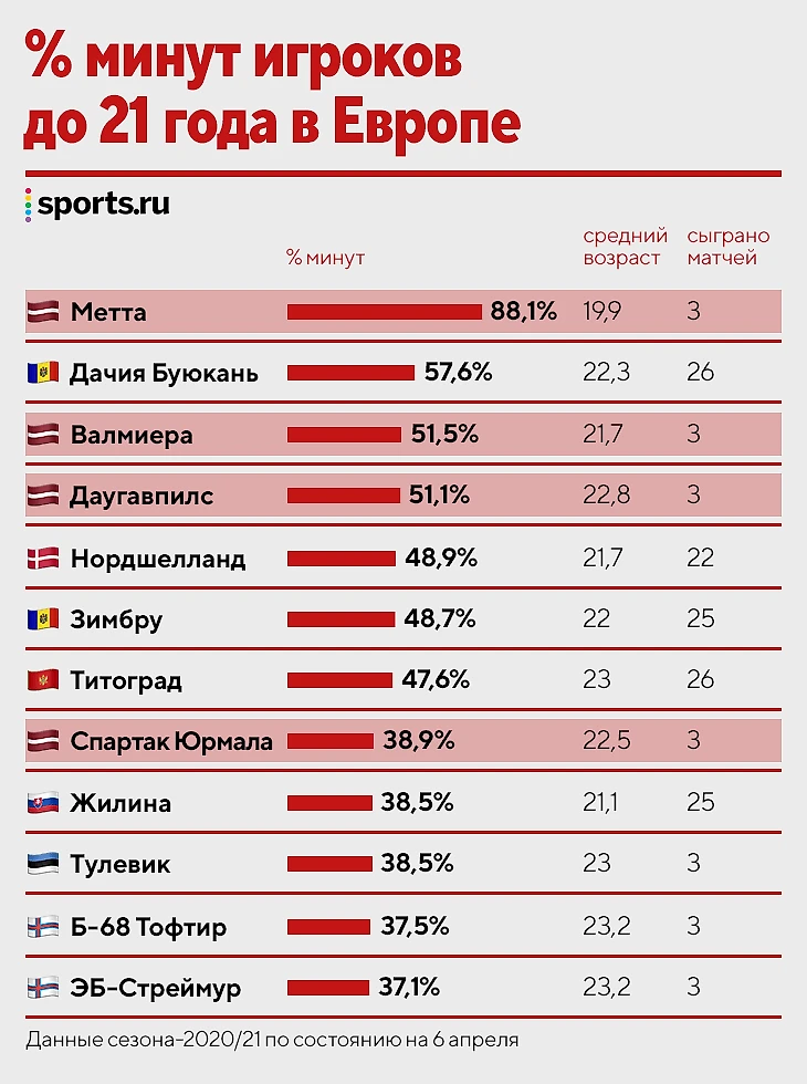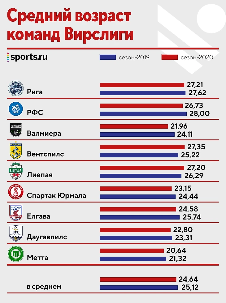 А уже в 2021 году клубы Вирслиги начали сезон со средним показателем в 24 года (второй показатель в высших лигах Европы после Словакии – 23,7).