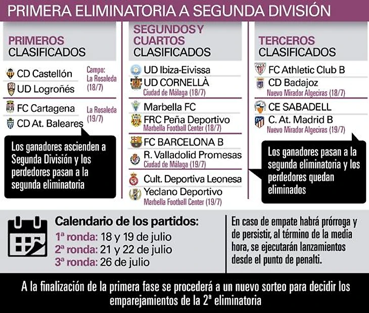 По завершении первого раунда состоится новая жеребьевка для определения полной схемы двух оставшихся раундов [это связано с регламентом, согласно которому при жеребьевке последующих раундов должны учитываться группы, лидеры которых проиграют в первом раунде, - прим. переводчика]. Второй раунд пройдет 21-го и 22-го июля, а 26-го июля в двух матчах третьего раунда разыграют последние две путевки в Сегунду.
