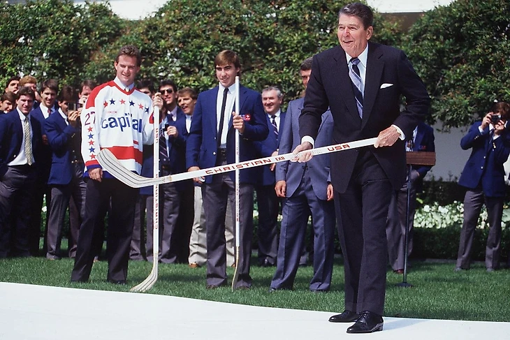 Так как команда из столицы США, за нее могут болеть и президенты. На фото хоккеисты Кэпиталз с Рональдом Рейганом- 40-м президентом США.