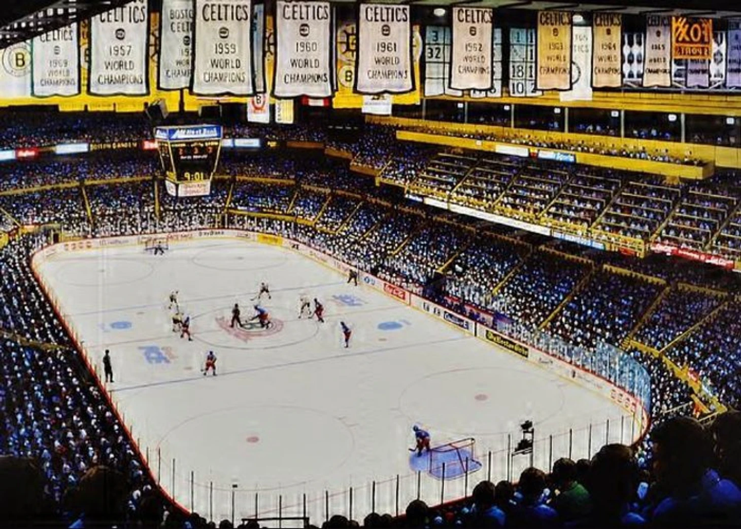 Boston Garden, стадион «Бостон Брюинз». «Гарден» был домом для «Бриюнз» с 1928 по 1995 год. За это время «мишки» шестнадцать раз выходили в финал Кубка Стэнли, выиграв его пять раз. Как и на «Чикаго Стэдиум» в «Гарден» была укороченная площадка, что позволяло бостонским хоккеистам играть в более агрессивный хоккей, из-за которого они получили прозвище «большие, плохие мишки» в 60-70-х.