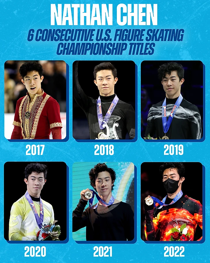 В прошедшие выходные фигурист из США Нейтан Чен выиграл национальный чемпионат в шестой раз подряд и сравнялся по числу побед с Тоддом Элдриджем (1990-1991, 1995, 1997-1998, 2002). Впереди с семью победами Роджер Тернер (1928-1934) и Дик Баттон (1946-1952). В условиях современной конкуренции, где исход соревнования решает каждая сотая, этот результат Нейтана можно смело назвать историческим. Как и то, что каждый свой титул он выигрывал безоговорочно и с солидным отрывом.
