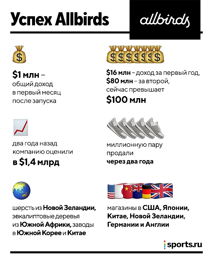 Через 15 месяцев после запуска The New York Times назвал Allbirds «сапожниками Кремниевой долины». Минималистичные кроссовки полюбили важные бизнесмены – сооснователь Google Ларри Пейдж, бывший босс Twitter Дик Костоло и венчурный инвестор Бен Горовиц. Да, в Кремниевой долине уважают практичную одежду.