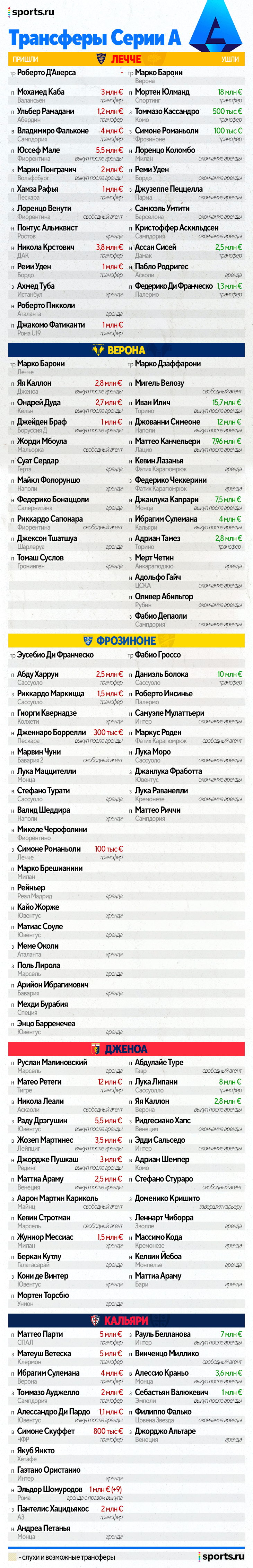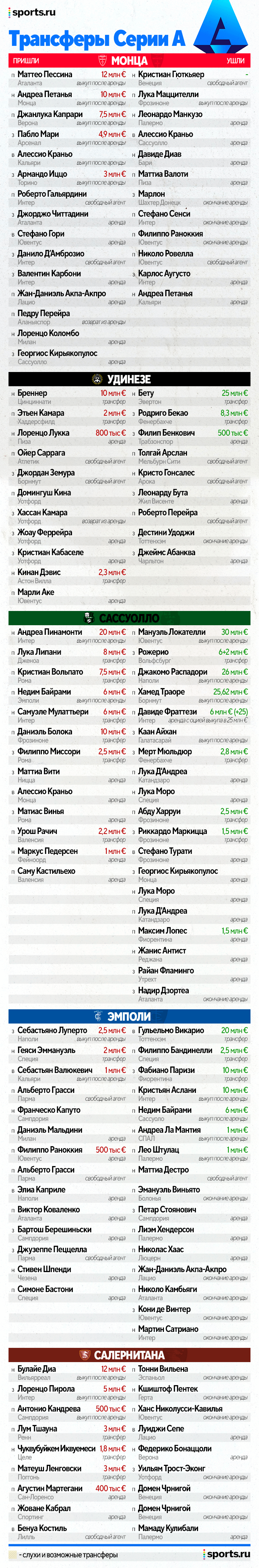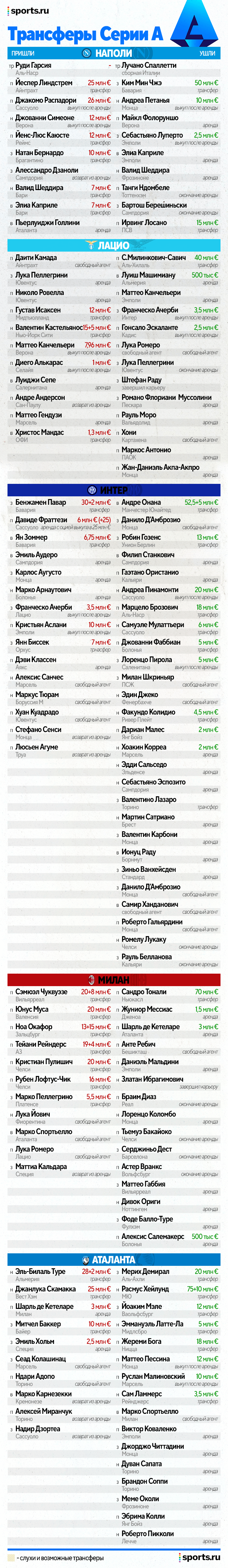 • Алексей Миранчук остался в «Аталанте», хотя ходили слухи о трансфере или аренде в «Салернитану», «Торино» и «Верону». Вот слова агента Миранчука: «У Алексея состоялся хороший и продуктивный разговор с Гасперини, во время которого тренер сказал: «Леша, спокойно готовься. В сборную не поедешь. Мы за тобой следили, мы тебя знаем, все будет хорошо. У тебя будут шансы, так что работай».