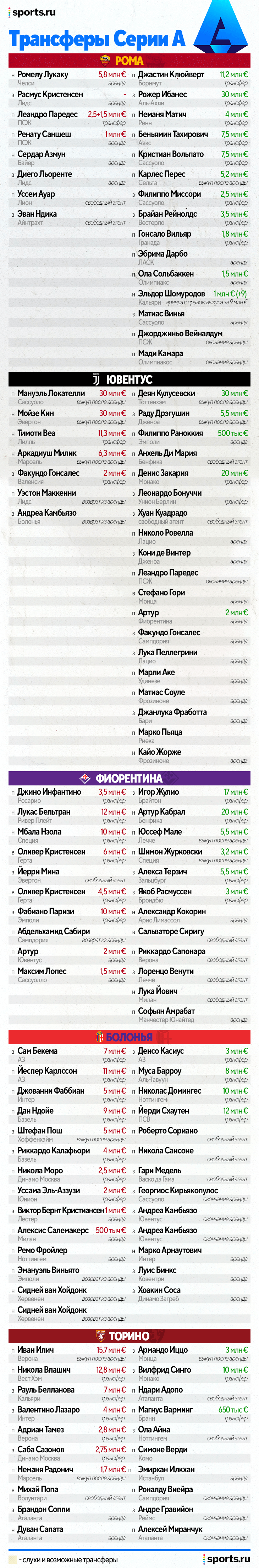• «Рома» арендовала Ромелу Лукаку у «Челси», Сердара Азмуна у «Байера» и Ренату Сашеша у «ПСЖ». Из Парижа также приехал Леандро Паредес. Из Рима в «Аль-Ахли» за солидные 30 миллионов уехал Рожер Ибанес. В целом «Рома» неплохо распродала некоторых игроков.