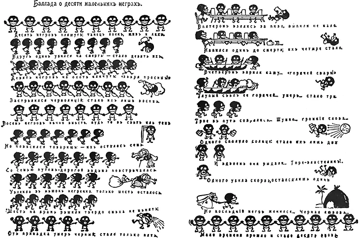 Роман Агаты Кристи "Десять негритят", ради политкорректности когда-то переименованный в "И никого не стало", написан на основе шутливой английской считалочки "Десять маленьких негров". В интернете можно найти несколько версий, одна из которых даже называется балладой, но не в этом суть. В считалочке юмором является то, как негритята умирают один за другим, из-за нелепых случайностей.