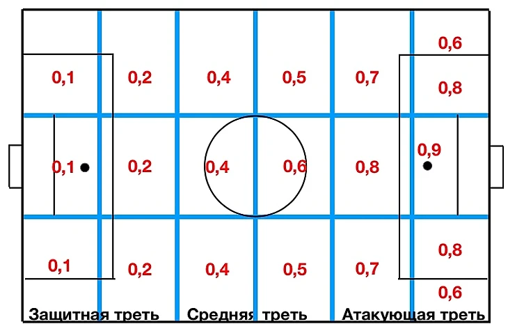 Условно дадим каждой из зон свой коэффициент , чем ближе открывание происходит к воротам соперника, тем выше этот коэффициент. Зоны у угловых флажков имеют меньший показатель, чем боковые зоны штрафной, что справедливо.