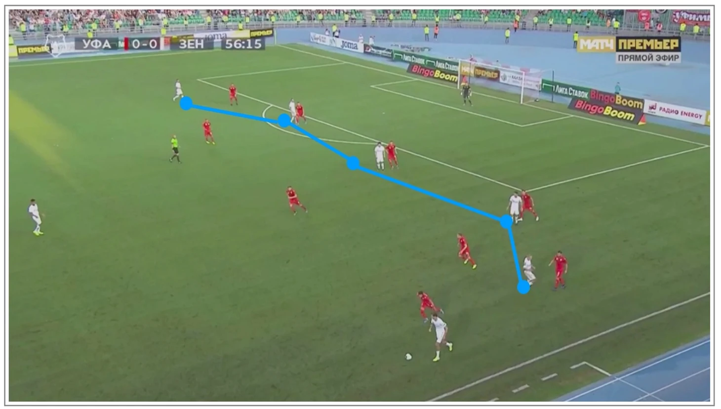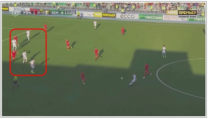5 игроков сине-бело-голубых располагается в линию при атаке команды. Смольников, с мячом, на деле имеет только 1 адресат для паса— Ерохин справа, не попавший в кадр. Азмун, Дзюба, Оздоев, Ригони находятся в зонах, пас в которые может быть рискованным, но хуже того, никто из них не открывается под одноклубника, мяч переходит Ерохину, который оказывается в еще более сложной ситуации.