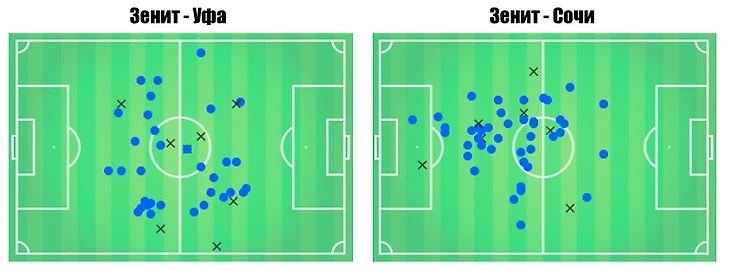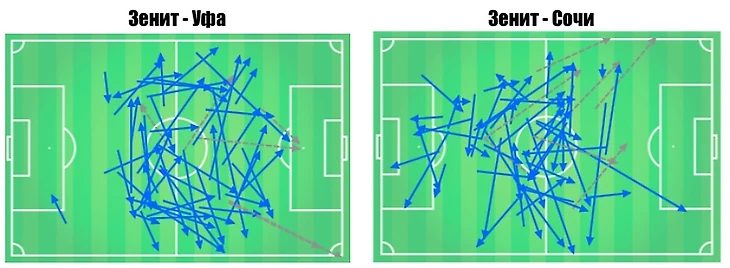 11 длинных передач ( 10 точных) в минувшую субботу к 4м передачам в июльском матче. 15 передач в финальную треть , что немногим более, чем в 2 раза превышает данные по матчу с сочинской командой. Да, мяч здесь опорник Зенита получал меньше, чем в сравниваемой игре, но и зоны, в которых он его получал отличаются.