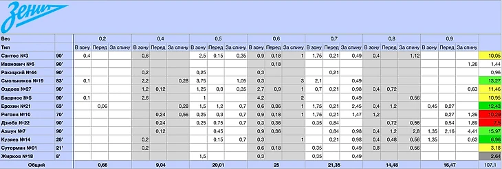 Во-вторых, команда почти не играла в ход. Тому способствовали условия, барицентр Зенита в этом матче был на средней отметке в 62,1, что говорит о большой плотности при передачах вперед. Поэтому самыми получающими в ход мяч стали Сантос и Смольников.