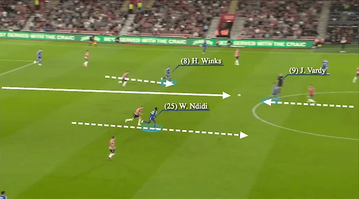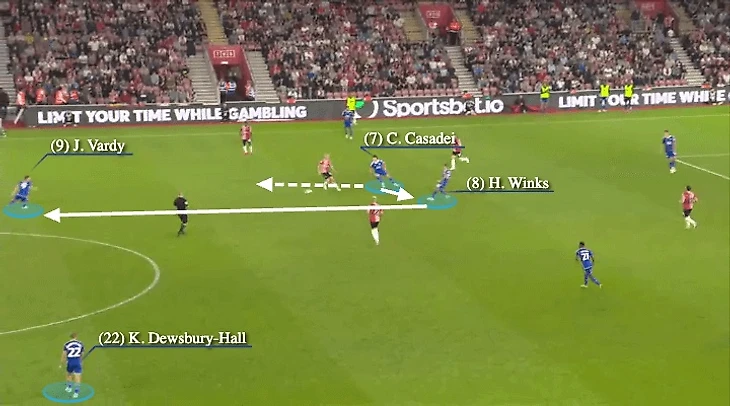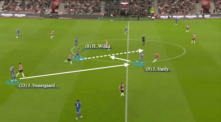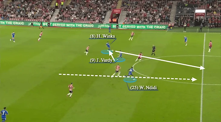 Если непонятно, давайте на примере. На картинках матч с «Саутгемптоном». Форвард, смещающийся в глубину — Варди, получает он длинный пас низом от вратаря Хермансена, а наши восьмёрки Уинкс и Ндиди бегут вперёд, уже сейчас открываясь для того, чтобы Варди скинул им мяч. Джейми моментально отдаёт на Уинкса, а тот тоже сразу же закидывает на Ндиди. Вот такие вот комбинации через центр.