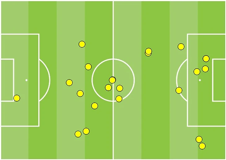 Вот ещё карта касаний нашего бессменного девятого номера. Добрая половина в центре поля, даже в опорной зоне. Форвард в традиционной системе игры вообще редко заходит на свою половину поля, а сейчас у Варди там большая часть активности в матчах.