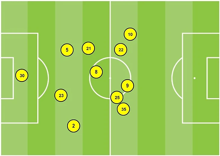 Карта усреднённых позиций из матча с Саутгемптоном. Обычно на таких графиках Варди (№9) очень заметно выступал спереди, а сейчас он на одной линии с пятью игроками Лестера, в том числе с Ндиди (№25). Находясь изначально в высокой позиции, Джейми часто убегает пониже, к полузащите, а восьмёрки — Уинкс (№8) и Ндиди — наоборот, с низкого старта постоянно бегут вперёд, ближе к чужим воротам, не боятся оставить пустые зоны сзади, потому что уверены, что не потеряют мяч впереди.