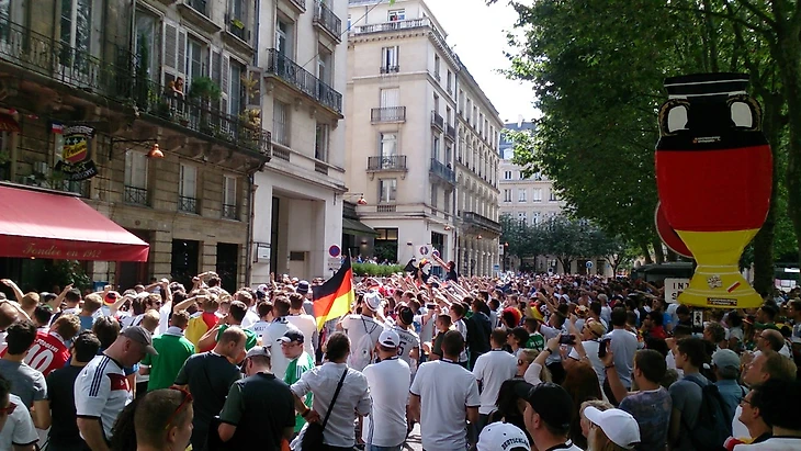 В какой-то момент на балкон над баром посмотреть на безумие под окнами вышла молодая француженка и немедленно стала главной звездой дня. Немцы полчаса пели ей песни, а один молодой человек даже забрался на балкон, и попросил разрешения её поцеловать. Этот поцелуй праздновали внизу как обычно отмечают забитый мяч. Через несколько минут девушку одарили немецкой майкой, немецким шарфом и немецким флагом.