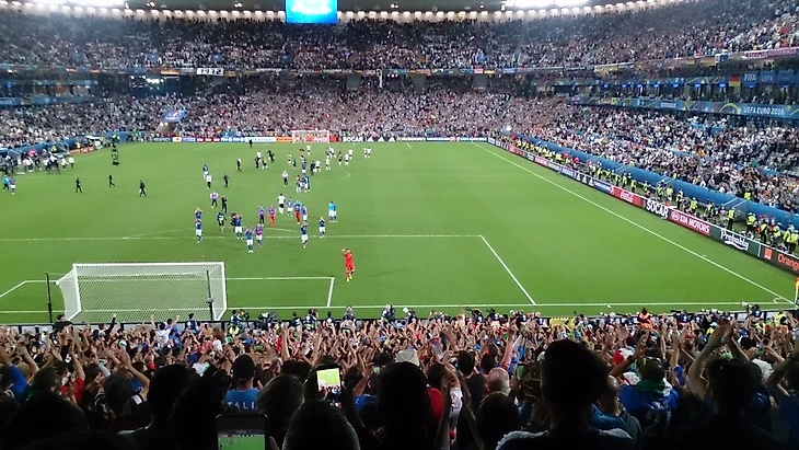 Немцев на трибунах было больше, немцы были более организованные, они громче пели и устроили красочный перфоманс во время исполнения гимнов. В итальянском секторе было много случайных людей, нейтральных болельщиков, да и немецких тоже хватало. Рядом со мной сидела местная девушка, которая тихо болела за Германию, и на всякий случай не проявляла лишних эмоций. По другую сторону итальянский ребенок, взгромоздившись ногами на сиденье невозмутимо доедал пиццу из огромной коробки, которую можно было купить прямо на стадионе. Позади меня настоящие брутальные тиффози, с разукрашенными красно-бело-зелеными лицами, страдают, радуются, поют, снова страдают, хватаются за сердца, а потом не будут скрывать слез после победного пенальти Хектора.