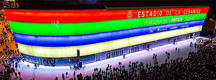 «Магазин открыли в конце ноября, но новогодние огоньки на нем появились только сегодня», — объясняли мне испанцы, а потом отходили подальше, чтобы лучше разглядеть новое лицо их любимого стадиона. Еще два месяца назад «Мадригал» (а с этого матча «Эстадио де ла Керамика») начали обклеивать желтой плиткой, а сейчас на новом фасаде высвечивают рекламу, крутят футбольные ролики и объясняют, как многое «Вильярреал» делает для развития города.