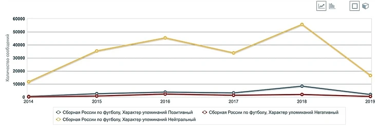 Чтобы подтвердить ощущения, мы обратили к компании «Медиалогия», которая анализирует все публикации СМИ – в том числе по эмоциональной окраске (позитивная, нейтральная, негативная). Нам прислали график, который показывает: во время Лиги наций про сборную нередко писали плохо, но в этом году негатива практически нет. Сейчас он вообще на минимуме за последние месяцы. Смотрите график по месяцам.