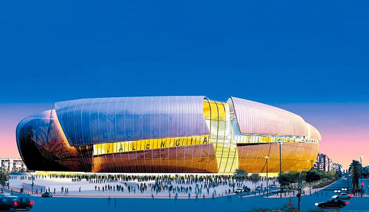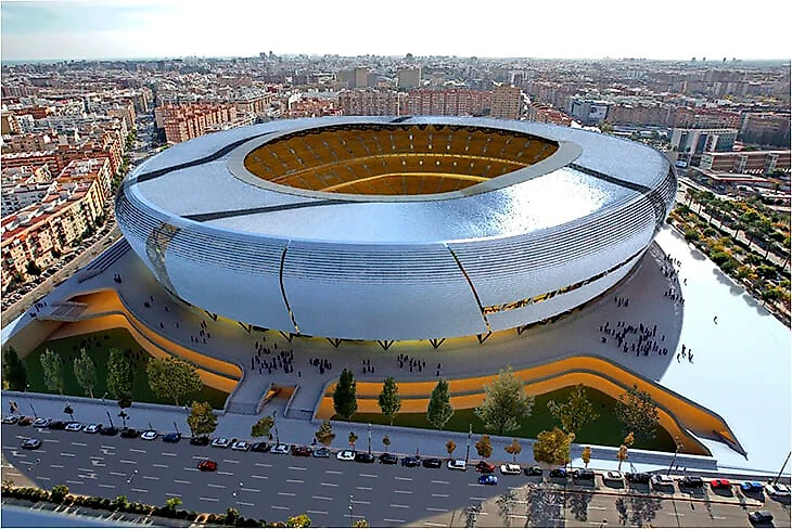 Арена на 75 тысяч с покрывающей все зрительские места крышей. 3500 парковочных мест. Внутри – клубный музей, отель, офисные и торговые здания. Внешне стадион, презентованный в музее Принца Филиппа в футуристическом валенсийском квартале «Городе искусств и наук», напоминал обтекаемую летающую тарелку, а линии на фасаде символизировали древнюю реку Турию, разделяющую город пополам.