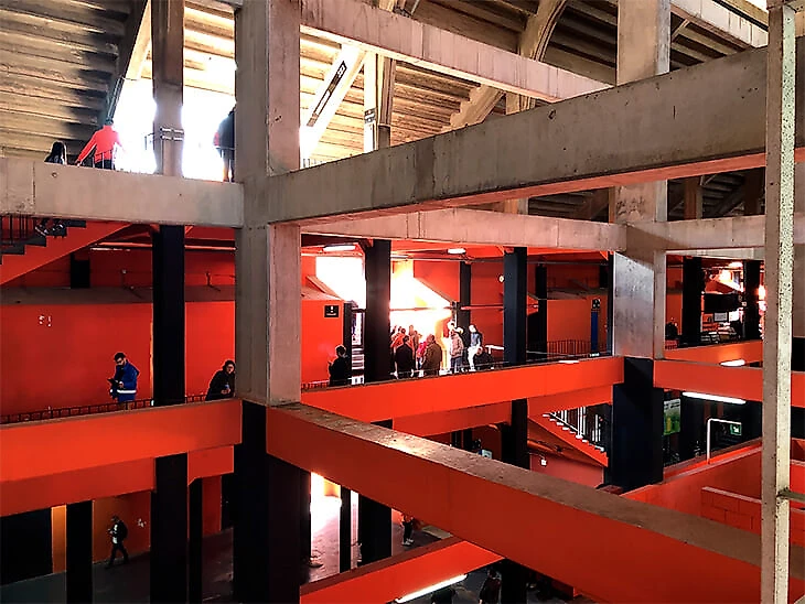 Сейчас повсюду оранжевые и черные цвета, новые кресла, инфографика с победными годами и чемпионскими составами. Хотя внутри все же заметны старые ребра стадиона, в разрезе он трескается даже под свежей оранжевой краской, не на всех трибунах есть туалет (где-то надо идти несколько этажей вниз).