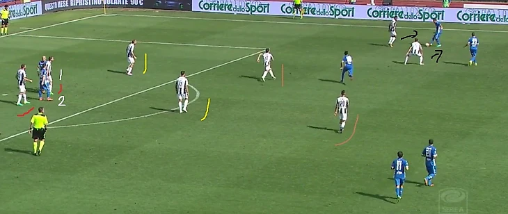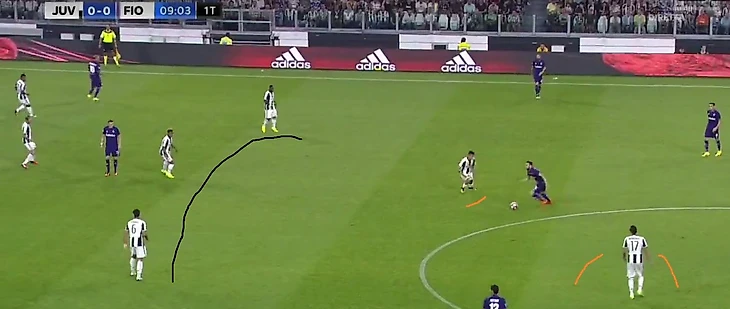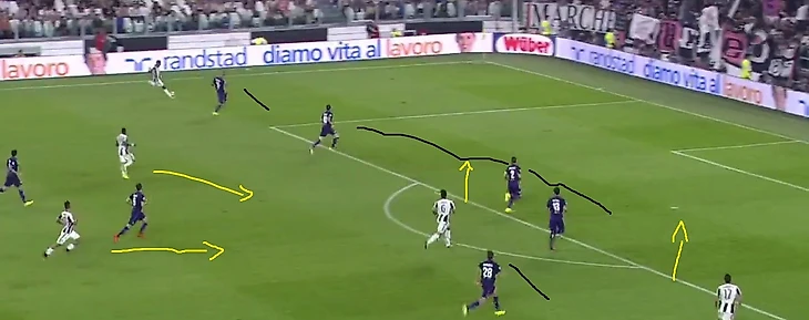 Одно из них – вышеописанное смещение второго форварда вглубь. Дибала ищет мяч в зоне Лемина, откуда и пытается обнаружить точным пасом одинокого Игуаина или Манджукича. Это не только ослабляет атакующий потенциал туринцев (а матчи с «Палермо» и «Лацио» - яркие тому свидетели), но и создает хаос в центре поля. Лемина теряет позицию, а Асамоа вообще забывает о том, что он должен делать.