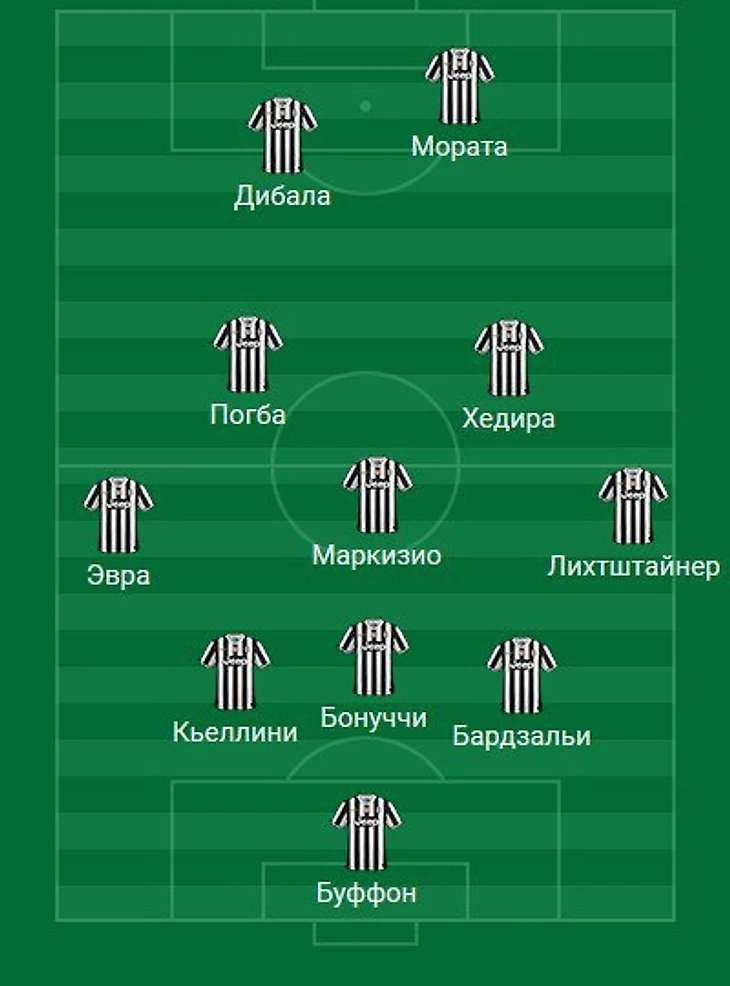 Зона в центре была разделена на три составляющие. Классический треугольник, где наконечником служил Клаудио Маркизио, четко распределял функции между его звеньями. Маркизио, помимо отбора мяча, всячески помогал Бонуччи с первым пасом. Сами Хедира или Квадво Асамоа задавали темп, доставляя мяч от одной зоны к другой. А Поль Погба уравновешивал фазы игры и чаще других оказывался на позиции последнего паса. Линия же нападения представляла собой хрестоматийное взаимодействие классической «девятки», Мораты, и играющего в подыгрыше Пауло Дибалы.