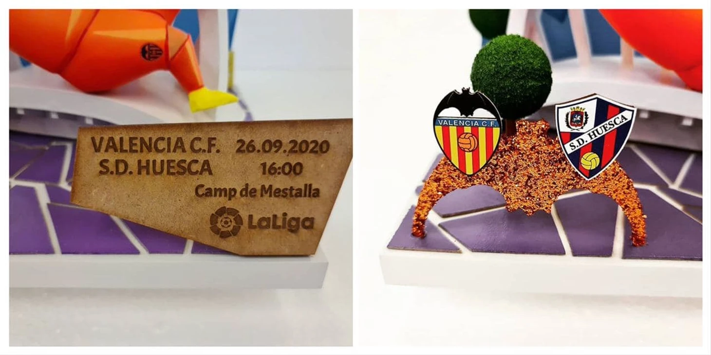 Первой из серии является статуэтка для «Уэски»: она была выполнена художниками Энрике Хименесом и Висенте Торресом из мастерской «SacabutxART». «Мы хотели изобразить детей, играющих в футбол, и, в большей степени, «Валенсию», в итоге получился ребёнок в футболке «Валенсии», который делает чилийский бросок», – объясняет Висенте Торрес. Ребёнок находится на Выставочном мосту, на фоне которого можно увидеть некоторые исторические памятники города: колокольня Эль Мигелете, площадь мэрии Валенсии, ворота Серранос. База статуэтки украшена мозаикой, а внизу находится копия летучей мыши, которая находится на «Месталье», с эмблемами обеих команд.