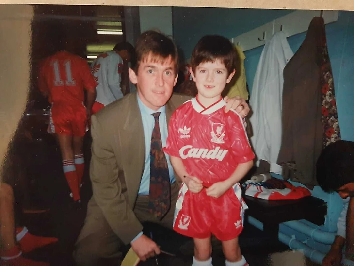 Талисман Пол Эшкрофт стоит рядом с Далглишем в раздевалке «Ливерпуля» в знаменитый вечер дерби в феврале 1991 года (Фото: Джон Эшкрофт)